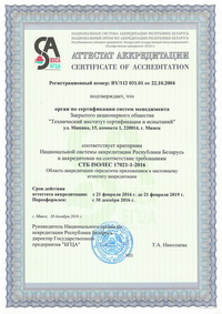 В феврале 2011 года успешно пройден периодический аудит деятельности органа по сертификации систем управления, подтверждена и продлена аккредитация на соответствие требованиям Национальной системы аккредитации Республики Беларусь, СТБ ISO IEC 17021-2010 (предыдущая аккредитация на соответствие СТБ ЕН 45011-99).